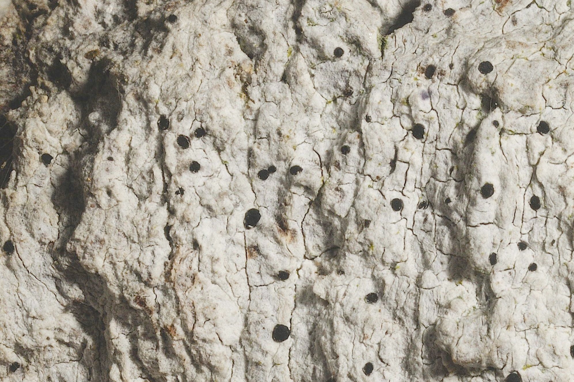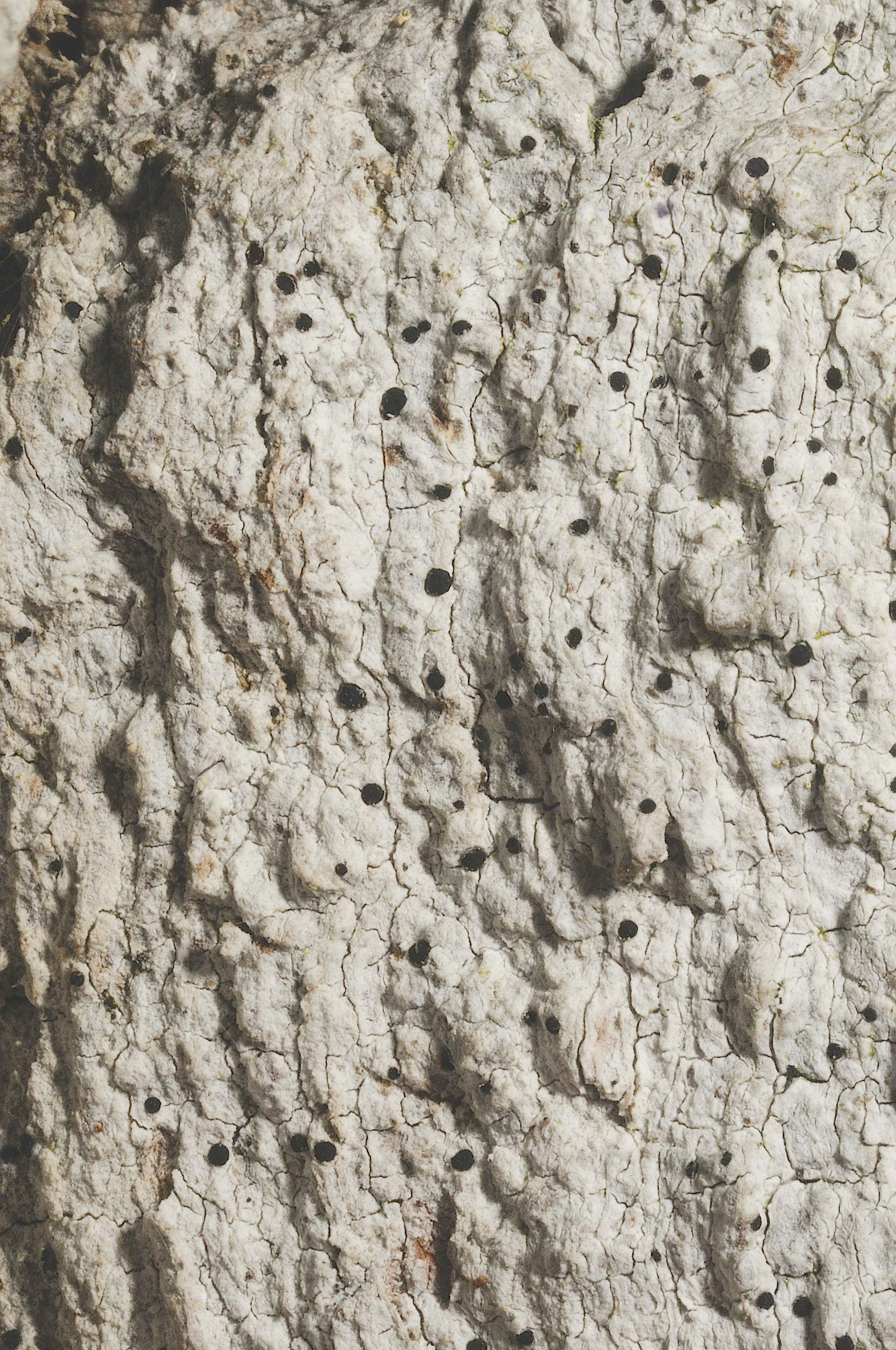 Bactrospora dryina est facile à reconnaître, impossible à confondre avec une autre espèce ; il est considéré comme une espèce parapluie pour de nombreux lichens, tous rares et menacés. Son grand thalle blanc s’étale sur les parties qui ne sont pas exposées à la pluie des troncs de vieux chênes, légèrement inclinés pour la plupart, souvent depuis la base du tronc jusqu’aux premières branches. Quand le lichen fructifie, la croûte homogène est recouverte des corps fructifères (apothécies) noirs, arrondis, de 1 mm de diamètre du partenaire champignon (Fig. 2 et 3). L’autre partenaire de symbiose de Bactrospora dryina est une algue verte filamenteuse du genre Trentepohlia.