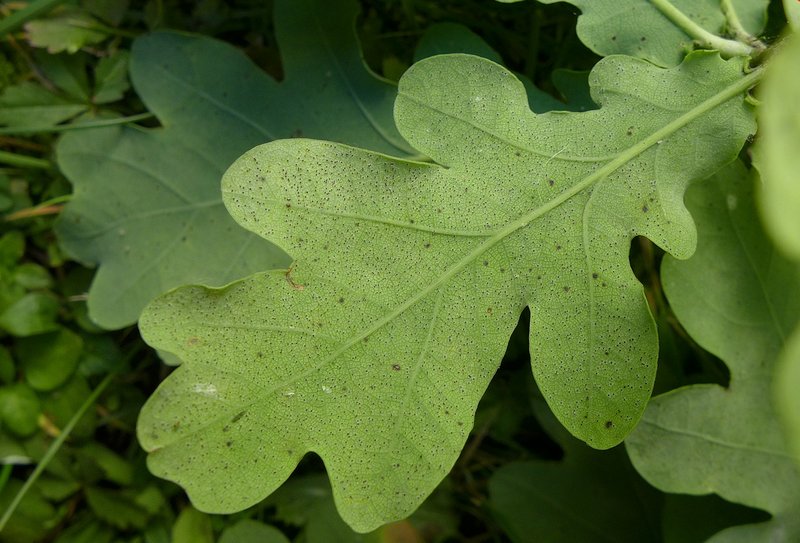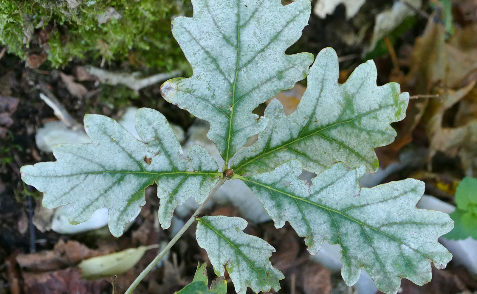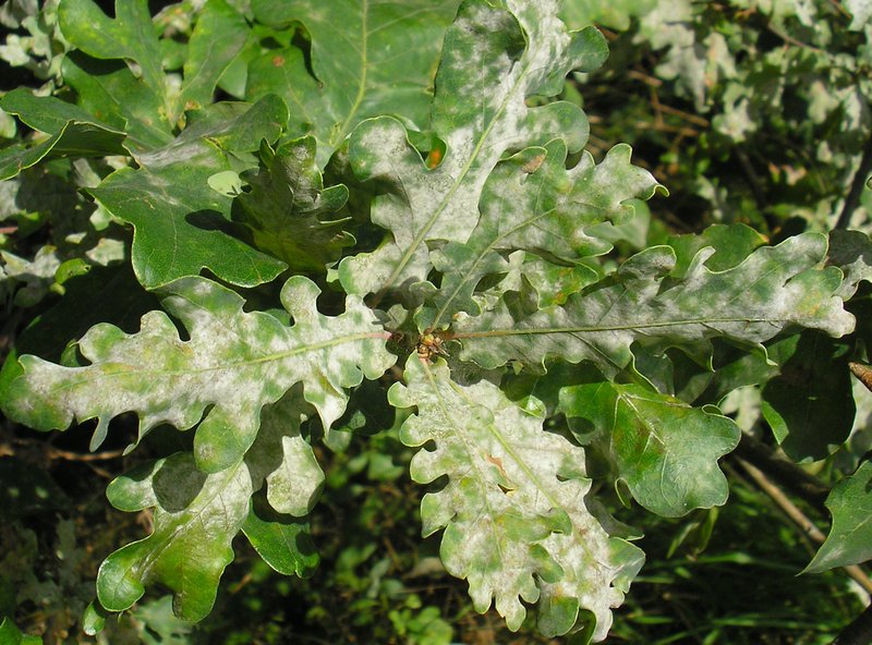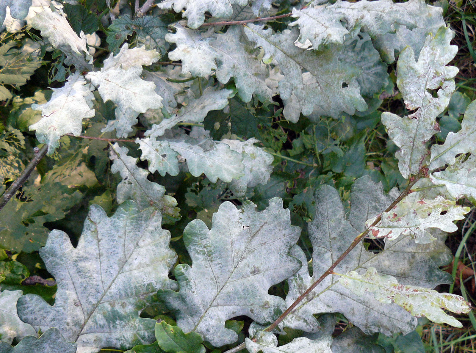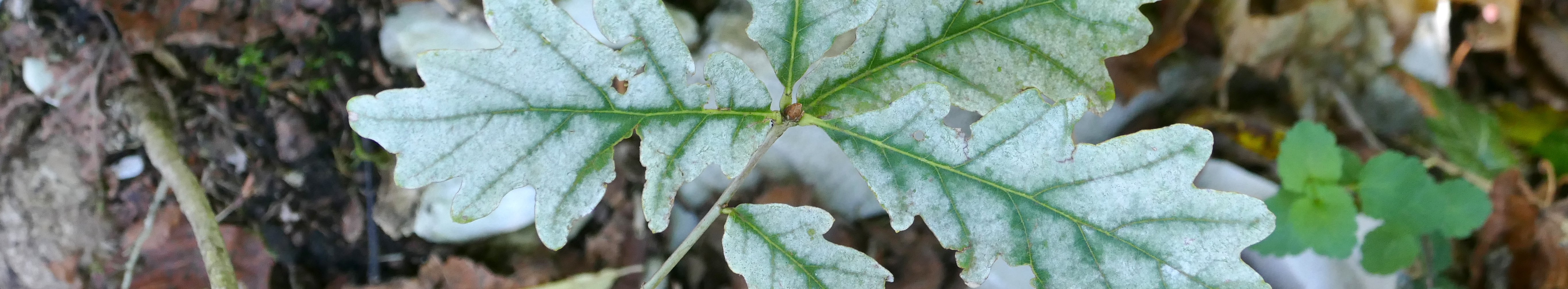 Erysiphe alphitoides (Fig. 1) est un oïdium très répandu et très voyant sur les chênes indigènes. Il se caractérise par une couche blanche poudreuse au stade conidien (spores asexuées), bien visible sur la face supérieure (parfois aussi sur la face inférieure) des jeunes feuilles de chêne qui paraissent souvent déformées. À l’automne se forment les cléistothèces (fructifications sexuées, petits points noirs). On peut trouver des feuilles infestées de chêne pendant presque toute la période de végétation, de mai à novembre.