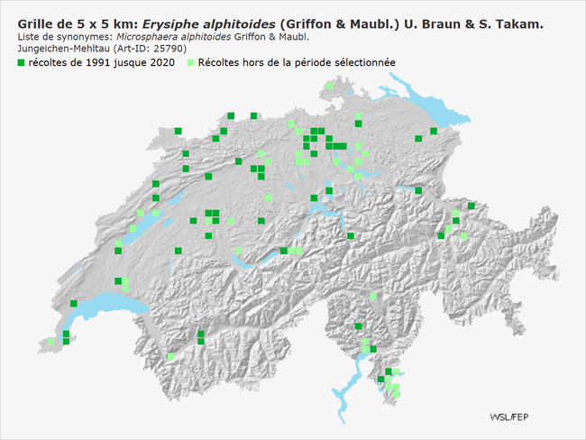 Les aires de répartition des trois espèces se recoupent fortement. Ces trois espèces sont aussi connues en Suisse où elles sont largement répandues, à part E. quercicola qui n’a été détectée que dans le canton du Tessin. E. alphitoides est aussi l’espèce la plus fréquente sur notre territoire, et se rencontre probablement presque partout où il y a des chênes. (Fig. 3)