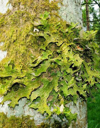 Lichen épiphyte: lichen qui pousse sur un arbre sans qu'il y ait de relation de parasitisme.