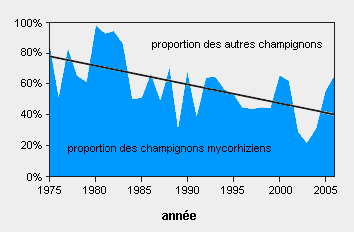 Il fut possible de prouver expérimentalement l’effet négatif de l’azote sur les champignons mycorhiziens. Avec un apport accru d’azote, non seulement les fructifications des champignons mycorhiziens diminuèrent, mais leur mycélium souterrain se rétracta aussi et ne réussit plus à former de mycorhizes sur les racines des arbres. Fort heureusement, la plupart des champignons réapparaisssent lorsque les dépôts d’azote retrouvent un niveau normal. Entre 1975 et 2006, une diminution des champignons mycorhiziens fut constatée dans la réserve mycologique de La Chanéaz (fig. 6). Dans La Chanéaz également, les dépôts d’azote atmosphérique sont probablement responsables des modifications de la flore fongique.