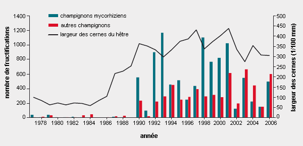 Une forte éclaircie effectuée en 1987 dans un vieux peuplement de la réserve mycologique de La Chanéaz entraîna de surprenants changements: après elle, on dénombra par an en moyenne quatre fois plus d’espèces de champignons et dix fois plus de fructifications qu’avant (fig. 7). L’augmentation des champignons mycorhiziens peut notamment s‘expliquer par la meilleure croissance des arbres à la suite de l’intervention. Par contraste, lors des années qui suivent un chablis ou une coupe rase, on n’observe aucune fructification de champignons mycorhiziens sur les surfaces concernées par un tel événement.