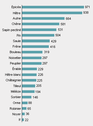 Toutes les essences n’ont pas le même nombre de champignons comme partenaires symbiotiques ou comme habitants. Des différences existent aussi bien chez les champignons mycorhiziens que chez les champignons saprophytes. En ce qui concerne les champignons xylophages, la plupart des espèces se rencontre sur les épicéas et les hêtres (fig. 8).
