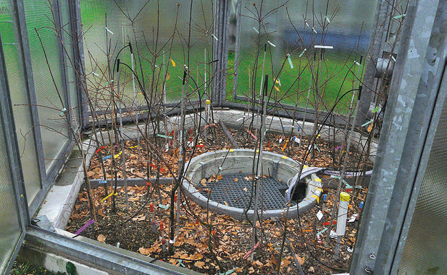 Fig. 2 - Chênes dans une chambre d’écosystème modélisé en hiver. Photo: Madeleine Günthardt-Goerg (WSL)