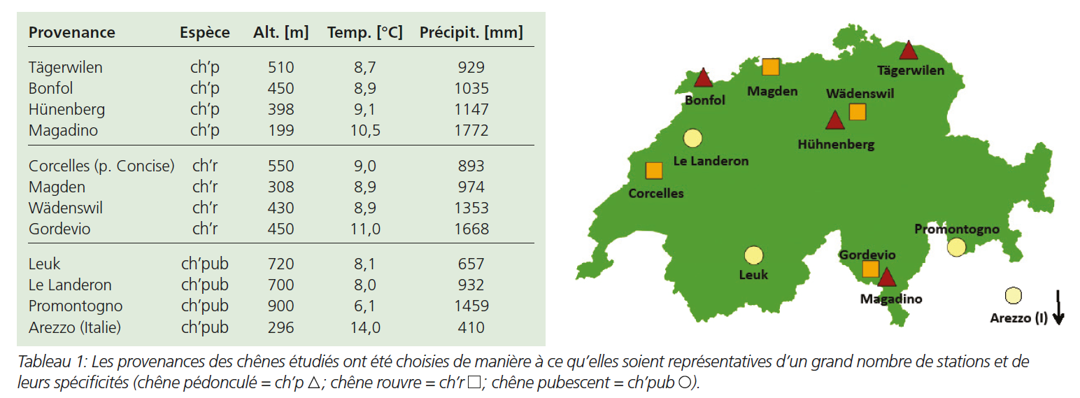 Les grandes différences de croissance entre les provenances – en relation avec la sécheresse et avec le réchauffement de l’air en particulier – peuvent être considérées comme indices d’une grande variété génétique au sein des populations de chênes. Des projets de recherches sur la génétique du chêne avaient dans le passé déjà démontré une diversité génétique au-dessus de la moyenne des espèces d’arbres.