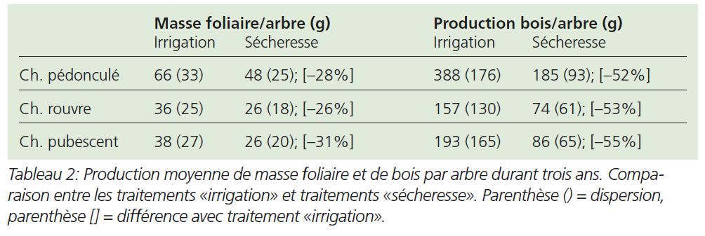 Même sans aucun traitement spécifique (contrôle), de grandes différences en ce qui concerne la croissance entre les différentes provenances sont apparues. Après trois ans d’expérimentation (2007 – 2009), la croissance en hauteur totale a varié fortement, tant au sein des mêmes espèces qu’entre les différentes espèces. Alors que par exemple le chêne pédonculé de Tägerwilen a atteint une hauteur moyenne de 230 cm (± 53) cm (dispersion), celui en provenance de Bonfol se retrouvait à 159 cm (± 36 cm) seulement. Le chêne pubescent a lui-même montré de grosses différences de croissances selon les provenances: 210 cm (± 67 cm) pour Le Landeron et 129 cm (± 67 cm) pour Promontogno. Arezzo, la provenance la plus méridionale, a eu une croissance encore plus réduite. Le diamètre du tronc en fin d’expérimentation a varié, pour les provenances suisses, entre 2,7 mm (Wädenswil) et 5,4 mm (Tägerwilen). La réaction à la sécheresse des 12 provenances a également été très marquée. En effet, le chêne pédonculé de Tägerwilen a montré une croissance en hauteur très affectée (–46% pour la longueur des pousses), tandis que le chêne pédonculé de Hünenberg n’a montré qu’une diminution de 36% comparativement au contrôle.