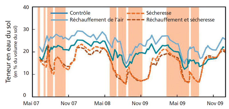 Fig. 3 - Teneur en eau du sol acide (pH 4) d’Eiken/AG à 62 cm de profondeur. En brun, les périodes de sécheresse simulées. Le régime hydrique du sol a varié en fonction de l’irrigation, de l’évaporation et de la croissance des plantes.