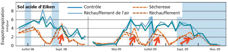 Pendant les périodes de végétation de 2007 à 2009, les plantes ont été arrosées au moyen d’un système sprinkler. Par temps de pluie, les toits en verre étaient fermés automatiquement, ce qui a permis de contrôler avec exactitude l’irrigation de tous les traitements. Pour les traitements contrôle et élévation de la température, l’arrosage correspondait à la précipitation moyenne naturelle de Birmensdorf (728 mm d’avril à octobre). Pour les traitements sécheresse, l’irrigation artificielle a été réduite en 2007 de 60% par rapport à la précipitation naturelle. En 2008 et 2009, le déficit a été limité à 43%.