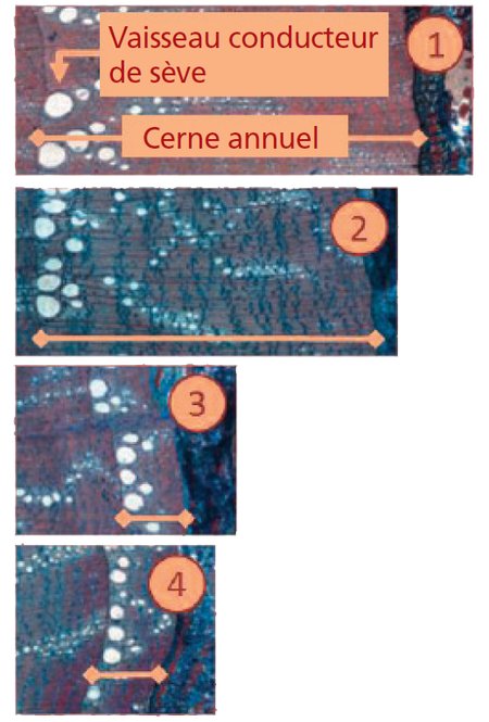 Fig. 6 - Formation de cernes de croissance. L’analyse des coupes de tronc du chêne pédonculé montre que les différents traitements conduisent à une adaptation des vaisseaux conducteurs de la sève brute (trachées) en ce qui concerne leur taille et leur présence. Ainsi, le chêne garanti, aussi durant une sécheresse, le bon fonctionnement de son système d’approvisionnement en eau. 1 = contrôle, 2 = élévation de la température, 3 = sécheresse, 4 = élévation de la température et sécheresse