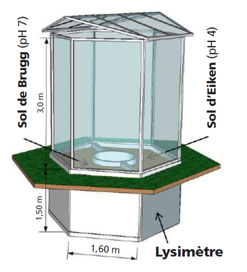 Les réserves d’eau dans le sol sont déterminantes pour le comportement des arbres pendant une période de sécheresse. Les chambres d’écosystème modélisé du WSL à Birmensdorf sont conçues pour l’étude de telles questions. Elles se composent d’une verrière de 3 m de haut qui repose sur un fondement hexagonal en béton d’une profondeur de 1,5 m. Celui-ci est divisé en deux compartiments étanches (lysimètres) dans lesquels, à l’aide de différents appareils de mesure, le régime hydrique du sol est déterminé (figure 1). Avant que les chênes ne fussent plantés, deux sols de forêts de chêne situés en Suisse ont été choisis pour servir de substrat de croissance dans les chambres d’écosystème modélisé. Un, calcaire, provenant de Brugg (pH 7) et l’autre, acide, d’Eiken (pH 4).