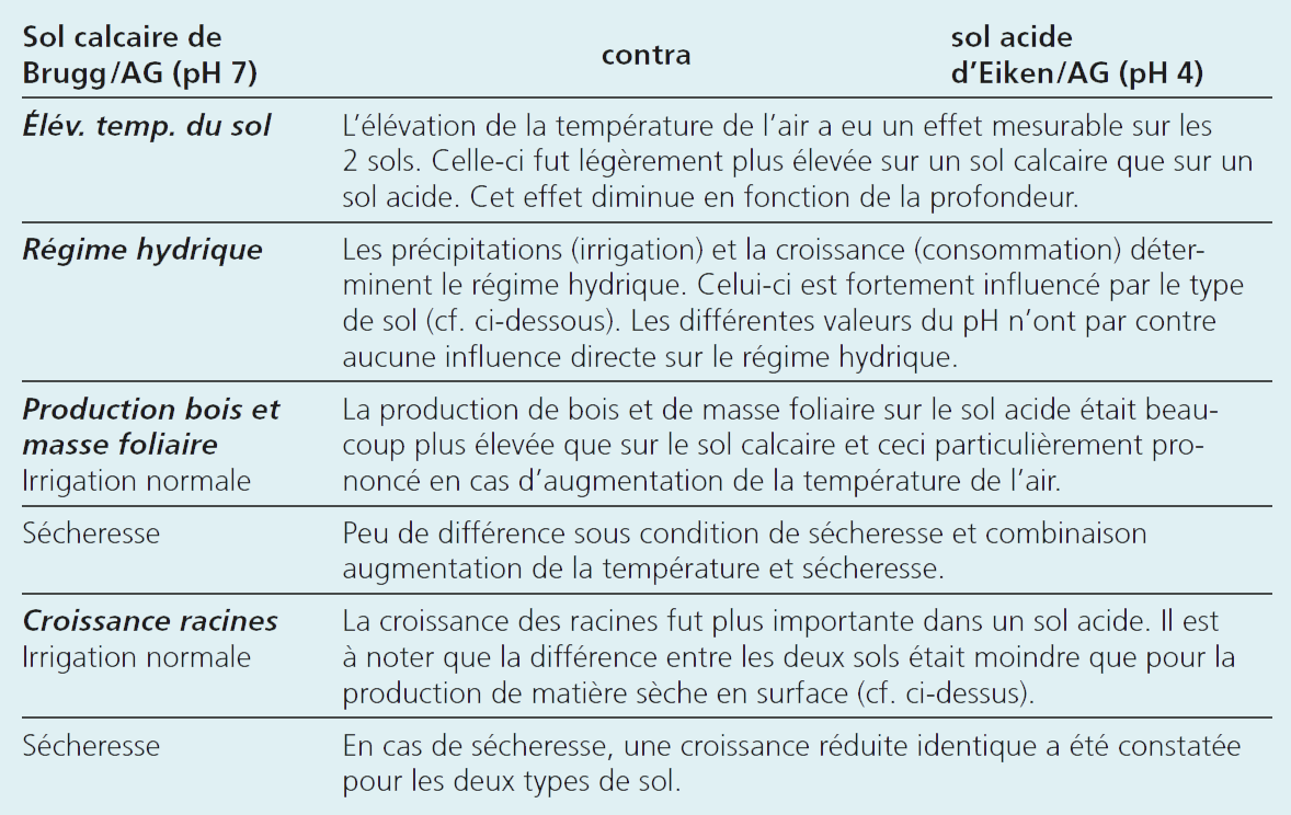 Le processus de la photosynthèse et la formation de biomasse requiert de l’eau. Sous condition d’irrigation normale, la croissance sur le sol acide d’Eiken/AG, du fait d’une meilleure disponibilité en nutriments, a été nettement supérieure a celle observée sur le sol calcaire de Brugg/AG (figure 7). Lors de la sécheresse, la différence s’est amenuisée. Ceci s’explique par la simulation d’une très forte sècheresse, résultant à un arrêt presque complet des activités biologiques du chêne – et ce indépendamment du type de sol (figure 4). Alors que, sous condition d’irrigation normale, le type de sol influence la croissance des jeunes chênes, il semble que la température et la sécheresse n’influencent que peu les réactions spécifiques dues au sol. Dans le tableau 1, les constatations importantes concernant le sol et la croissance sont résumées.
