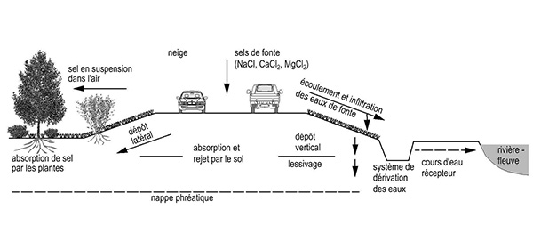 - nouveaux apports directs dans le sol suite au salage (sel soufflé par le vent, embruns des véhicules, action des chasse-neige, eau de fonte)
