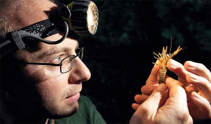 Fig. 1 - C’est la nuit que l’on observe les écrevisses: elles quittent leur cachette à la tombée du jour. Thomas Stucki, du service argovien de la pêche, a capturé une écrevisse à pattes blanches. Photo: BAFU/AURA