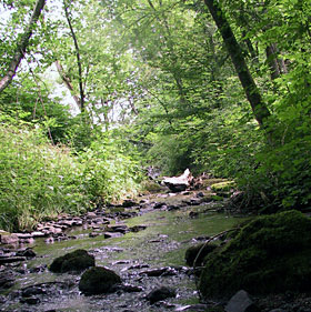 Fig. 2 - Ce ruisseau offre à l’écrevisse tout ce dont elle a besoin sur une grande partie de son parcours: une eau propre, des fonds variés et des rives naturelles, avec de nombreuses cachettes où passer la journée. Photo: Michael Kugler, St. Gallen