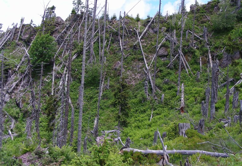 Fig. 1. Le typographe peut provoquer un désordre utile sur le plan écologique. Après une infestation, un nouvel habitat se forme, avec des plantes herbacées, des arbustes pionniers et beaucoup de bois mort. D’innombrables organismes tirent profit de cet habitat jusqu’à ce qu’une forêt dense se reforme et accueille à son tour d’autres habitants. Photo: Doris Hölling