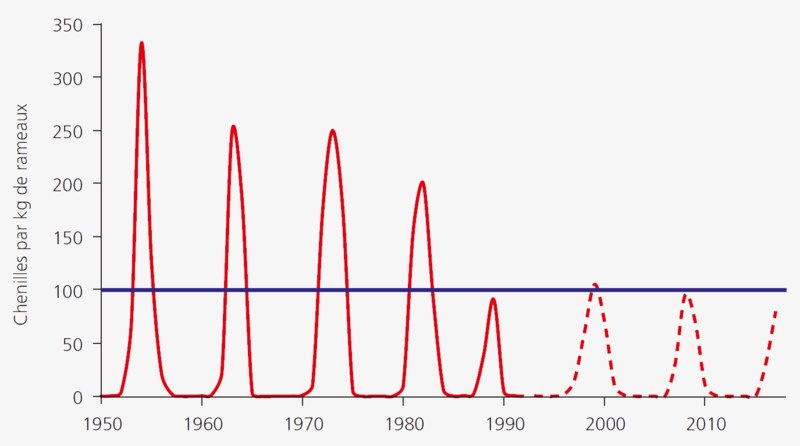 Fig. 3. Variation cyclique des populations de tordeuses du mélèze en Haute-Engadine. La périodicité est en moyenne de huit ans et demi, le seuil à partir duquel un mélézin se colore est de 100 chenilles par kilo de branchage (ligne bleue). La ligne rouge continue provient des données de Baltensweiler (1993a) et de Baltensweiler et Rubli (1999), la ligne en pointillé est issue d’estimations faites sur le terrain.