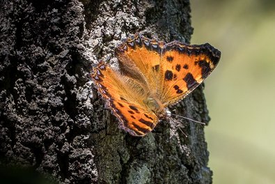 Fig. 6: La Grande Tortue (Nymphalis polychloros) se distingue de sa cousine, la Petite Tortue (Aglais urticae), par une tache noire supplémentaire sur la face supérieure des ailes antérieures. Cette espèce peut également être reconnue à sa teinte générale orange-brun clair, la Petite Tortue étant un peu plus rougeâtre. Photo: Goran Dušej