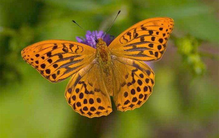 Fig. 9: Le Tabac d’Espagne (Argynnis paphia) se reconnaît facilement aux taches sur sa face supérieure. Sur le dessus des ailes antérieures du mâle, les quatre larges bandes d’écailles foncées situées le long des nervures diffusent des phéromones. Photo: Goran Dušej