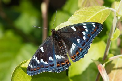 Fig. 4: Le Petit Sylvain (Limenitis camilla) est nettement plus petit que le Grand Sylvain. Il ne possède pas le même liseré de taches orange,mais certains spécimens peuvent néanmoins présenter une petite tache orange sur la face supérieure des ailes postérieures. Les mâles et les femelles sont très semblables. Foto: Goran Dušej