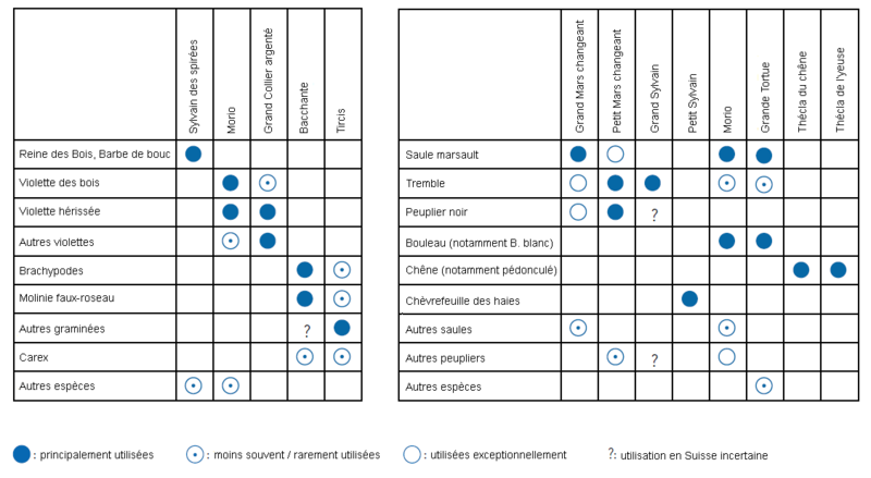On peut séparer les papillons diurnes forestiers grossièrement en deux groupes, selon leurs exigences: les papillons forestiers à chenilles arboricoles, se nourrissant de feuilles de buissons ou d’arbres, et les papillons à chenilles se développant sur les graminées ou d'autres plantes basses, dont les larves vivent dans la strate herbacée du sous-bois ou des ourlets.