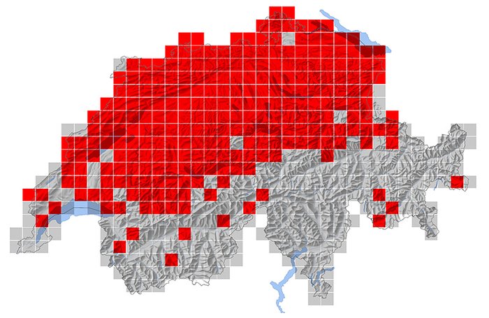 Uniquement au nord des Alpes. La limite ouest de la répartition principale suit une ligne de Fribourg au Jura. Localement aussi dans quelques vallées des Alpes et des Préalpes ainsi qu'en Suisse romande. Niche généralement entre 600 et 1000 mètres d’altitude, preuve la plus élevée au-dessus de 1500 mètres.