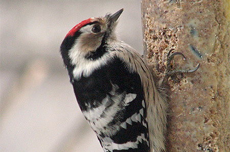 Principaux critères d'identification: Plumage en majorité noir et blanc, sous-caudales rouges; nuque rouge carmin chez le mâle, femelle adulte sans rouge sur la tête. Chez les juvéniles, les deux sexes ont une calotte rouge.