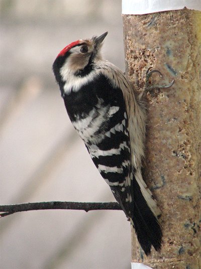 Principales caractéristiques: Le plus petit des pics européens, de la taille d'une mésange charbonnière. Plumage noir et blanc; ailes et bas du dos rayé; flancs légèrement striés; dessous sans rouge; calotte rouge carmin chez le mâle, foncée chez la femelle.
