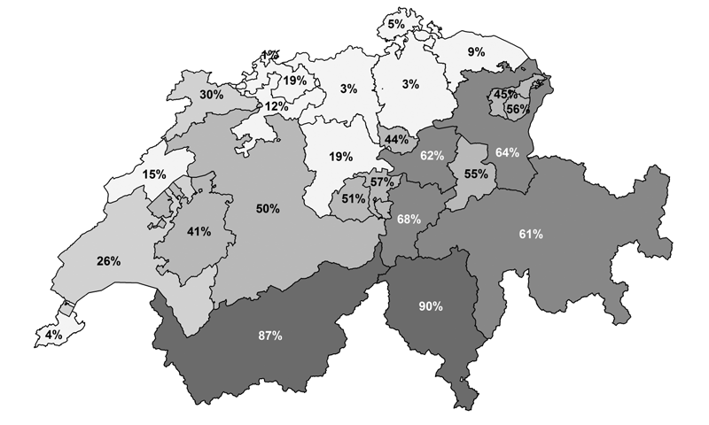 Fig. 3. Proportion de forêts protectrices dans les cantons. Source: Office fédéral de l’environnement OFEV