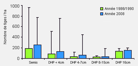 Ces récents relevés confirment que l’efficacité de la protection s’est plutôt améliorée dans la plupart des zones boisées où des avalanches s’étaient produites par le passé. Dans un premier temps, les modifications se limitent essentiellement à la régénération (arbres avec un DHP < 8 cm, Fig. 3). Elles présentent, selon les conditions stationnelles, de grandes différences en la matière. Ainsi, pour les forêts dans lesquelles la concurrence de la végétation est forte et où le bois en décomposition est quasiment absent, ou pour celles que les facteurs nivologiques perturbent continuellement, l’efficacité de la protection n’a guère évolué.