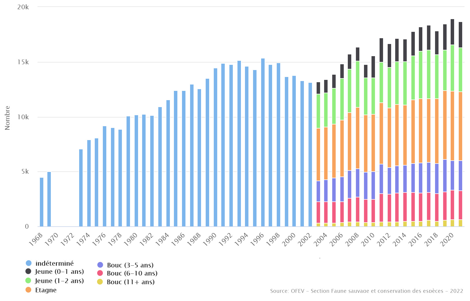 Fig. 3 - Effectifs de bouquetins en Suisse de 1968 à 2021. Source: Statistique fédérale de la chasse, OFEV