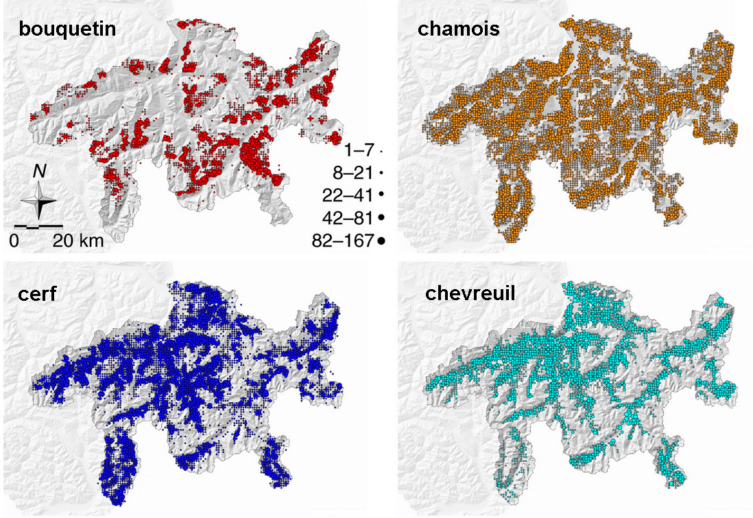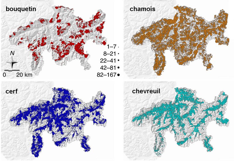 Au cours des dernières décennies, les chercheurs ont documenté de nombreux exemples d’espèces d’animaux et de plantes qui ont gagné des altitudes plus élevées en raison des changements climatiques. Une équipe internationale de scientifiques sous la direction de l’Institut fédéral de recherches WSL viennent de démontrer, grâce à un jeu de données unique au monde, que ces déplacements affectent également les trois espèces d’ongulés des Alpes. L’Office de la chasse et de la pêche des Grisons a documenté plus de 230 000 emplacements où des daims, cerfs élaphes, chamois et bouquetins ont été abattus entre 1991 et 2013 dans ce canton.