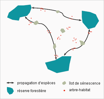Des habitats riches en bois mort de différentes tailles et interconnectés sont nécessaires à la survie à long terme des organismes tributaires du bois mort (fig. 7). Les réserves forestières naturelles constituent les habitats-clés. Les îlots de sénescence ainsi que les arbres-habitats revêtent toutefois une fonction importante en tant que biotopes-relais facilitant l’échange d’individus entre populations. Il n’existe pas de recette miracle pour répartir les trois éléments suivants: réserves forestières naturelles, îlots de sénescence et arbres-habitats. La règle générale veut que soient délimités, en plus des réserves forestières naturelles, environ deux à trois îlots de sénescence par kilomètre carré de forêt, d’une surface minimale de 1 hectare, et que soient définis cinq à dix arbres-habitats par hectare.
