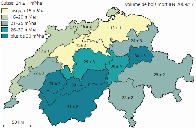 Le volume de bois mort en Suisse s’élève à 24 m3/ha en moyenne dans l’IFN 2009/17 (fig. 5). S’y ajoute le fait que la récolte de bois n’est plus rentable dans les zones difficiles d’accès. Par rapport à jadis, une plus grande quantité d’arbres restent à nouveau en forêt après leur mort. Selon l’IFN 2009/17, 20% des peuplements forestiers suisses ne sont plus exploités depuis plus de 50 ans. N’oublions pas non plus que les propriétaires de forêts et les exploitants sont aujourd’hui mieux informés de l’importance écologique du bois mort.