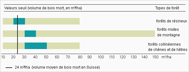Les valeurs seuils indiquent les quantités minimales de bois mort requises pour préserver les espèces spécialisées. Il importe de déterminer les valeurs seuils écologiques pour le plus grand nombre d’espèces possible afin de mieux définir les valeurs cibles pour les quantités de bois mort. De telles valeurs cibles ont été fixées par l’Office fédéral de l’environnement dans la Politique forestière 2020: 20 m3/ha pour le Jura, le Plateau et le sud des Alpes; 25 m3/ha pour les Préalpes et les Alpes. La plupart des espèces peuvent survivre avec des volumes de bois mort compris entre 20 et 50 m3/ha (fig. 6).