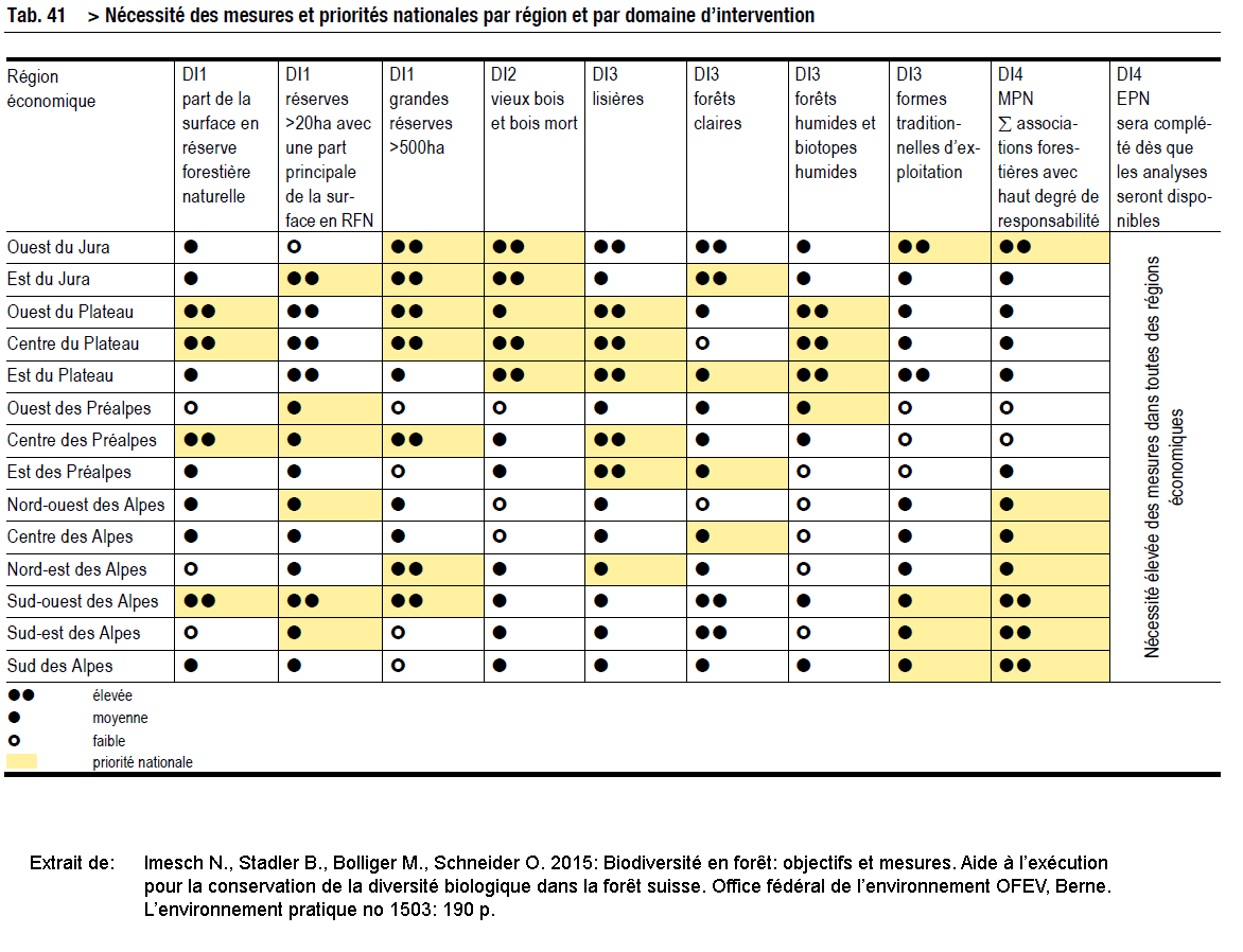 Il faut par exemple, mettre l’accent sur la conservation de milieux naturels forestiers prioritaires au plan national dans les régions du sud des Alpes. Dans les Préalpes centrales et orientales, sur le Plateau et dans l’ouest du Jura, une des mesures prioritaires porte sur la conservation des lisières naturellement structurées. La conservation des espèces forestières prioritaires au plan national et des boisements de grande valeur écologique a la plus haute priorité dans tout le pays, alors que sur le Plateau, on constate un manque préoccupant de forêts humides et de biotopes.