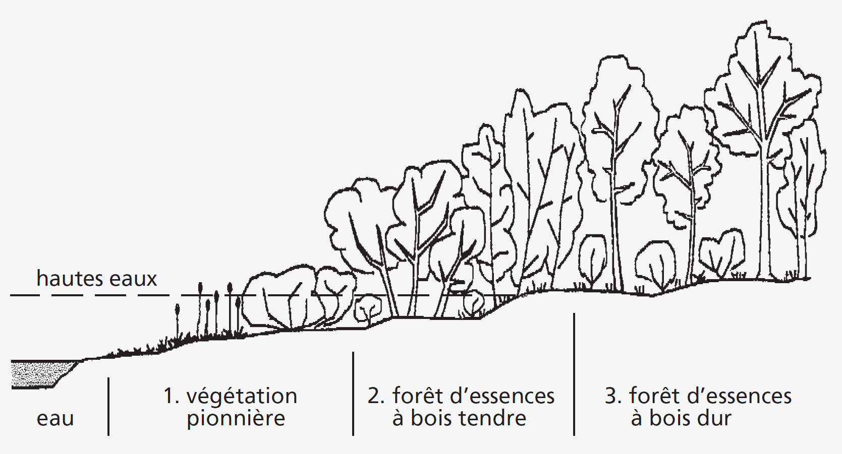 - Dans les parties les plus éloignées du cours d’eau, ainsi que sur les terrasses alluviales les plus élevées mais encore sous l’influence (permanente ou temporaire) de la nappe phréatique s’installent, après plusieurs années ou décennies de stabilité, des forêts de frênes, d’érables, d’ormes ou même de hêtres, de chênes ou d’épicéas. Ces forêts d’essences à bois dur sont caractérisées par la dominance d’arbres à bois relativement lourd et durable.