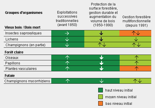 La biodiversité en forêt a changé. Avant la Révolution industrielle, les utilisations de la forêt étaient multiples – bois de chauffage, ramassage de litière, pâturage -, et donc les peuplements étaient étagés et clairs. Sous la pression grandissante de l'industrialisation, la récolte intensive de bois recourut aux coupes rases. Des essences fortement productives furent plantées à grande échelle. La biodiversité ne tarda pas à reculer dans ces peuplements monospécifiques, sombres et pauvres en structure. Par ailleurs, l'utilisation pendant des décennies du bois mort pour le chauffage et la cuisine a entraîné une diminution des espèces de champignons xylophages et autres organismes dépendants du bois mort.