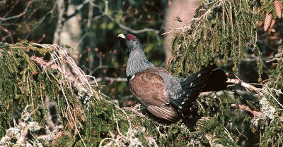 Fig. 1. Le Grand Tétras sur un épicéa. De par sa taille déjà imposante, il ne passe pas inaperçu. Un mâle adulte peut peser jusqu’à 5,5 kg. Au printemps, les coqs se rassemblent pour parader sur des places de chant où ils défendent leur territoire et sollicitent les faveurs des poules. Photo: R. & S. Nussbaumer