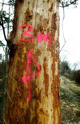 Fig. 4 - La promotion du bois mort est aussi possible le long des sentiers. La flèche rouge et l’inscription signifient que ce tronc doit être coupé à trois mètres de hauteur.