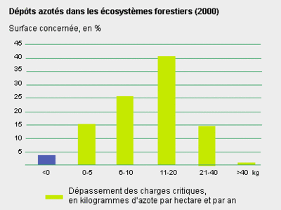 La qualité des eaux souterraines provenant des zones boisées est aujourd’hui menacée par les fortes quantités d’azote et d’autres substances acidifiantes qui parviennent dans les forêts. Des modélisations indiquent en effet que l’acidité critique est dépassée sur 34 % de la surface forestière suisse. De plus, 95 % de nos forêts subissent des immissions excessives d’azote. Cet azote, surtout sous forme d’ammoniac (NH3), provient pour près de deux tiers de l’agriculture, plus précisément de l’élevage d’animaux de rente. Le reste est constitué par les oxydes d’azote (NOx) rejetés par les chauffages et les véhicules à moteur.