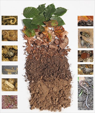 Le sol forestier est l’habitat d’une multitude d’organismes du sol qui présentent une grande diversité d’espèces (fig. 2 et 3). Ils utilisent comme nourriture la litière tombée au sol qu’ils broient, décomposent, digèrent et constituent ainsi entre eux un système d’entraide. De nombreux organismes vivants prédateurs comme les acariens prédateurs et les chilopodes habitent également le sol forestier. Les décomposeurs primaires mentionnés ci-dessus leur servent de nourriture. Ainsi se crée une chaîne alimentaire.