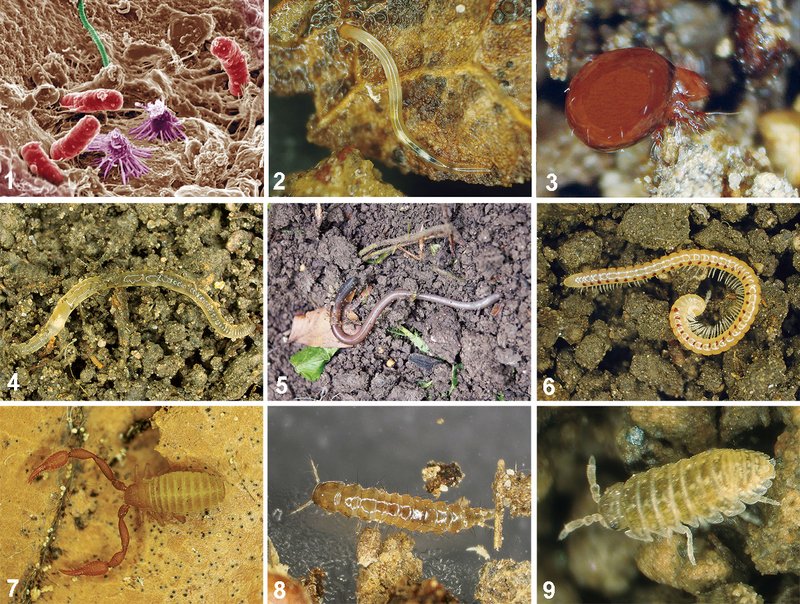 Fig. 2. Aperçu photographique d'importantes organismes du sol: 1) bactéries, 2) nématodes, 3) oribates, 4) enchytrées, 5) vers de terre, 6) diplopodes, 7) pseudoscorpions, 8) larves d'insectes, 9) isopodes. Photos: Alice Dohnalkova/Pacific Northwest National Laboratory, Marco Walser et Doris Schneider Mathis.