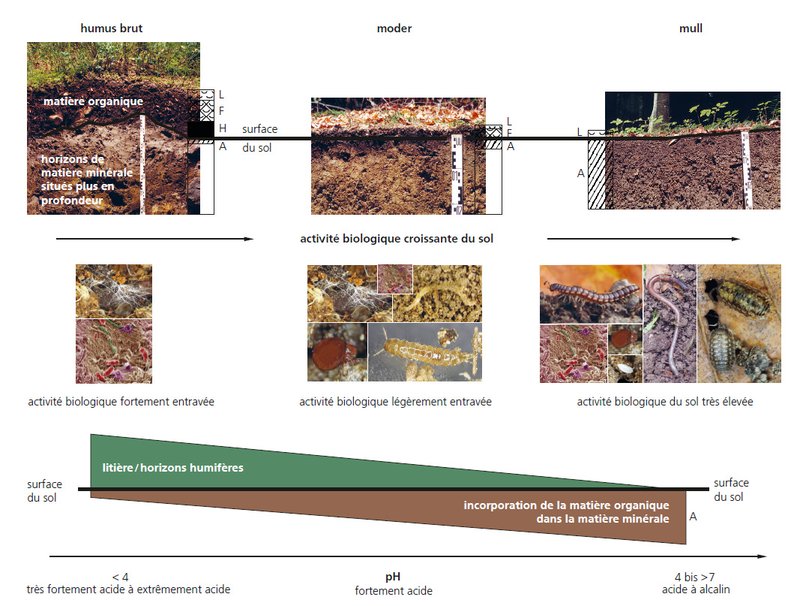 En fonction du climat, de la litière et de la roche-mère géologique apparaissent différentes formes d’humus. La forme d’humus est un indicateur de la capacité de transformation des éléments nutritifs dans le sol de surface et par là même du degré d’activité biologique dans le sol (fig. 6). Dans la forêt suisse, les trois formes suivantes d’humus se constituent dans les sols normalement perméables: