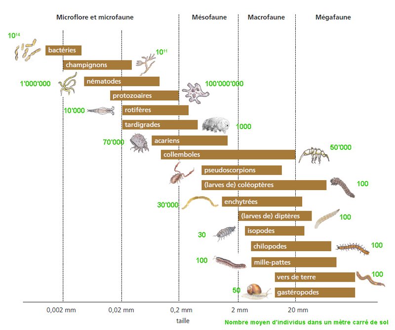 Fig 3. Taille des organismes du sol, ou diamètre des hyphes des champignons (d’après Briones 2014) et nombre moyen d’individus chez les organismes du sol les plus importants dans un mètre carré de sol (d’après Dunger 1983).