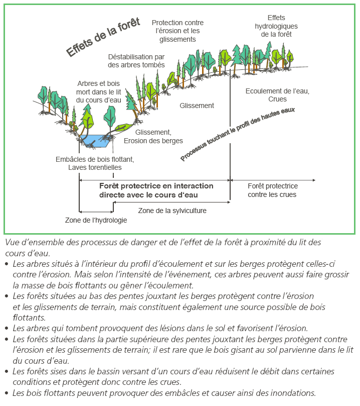 Les arbres stabilisent les berges et les versants des cours d’eau. Comme une armature, les racines des arbres retiennent les matériaux du sol et réduisent le danger d’érosion et de glissements. La forêt produit son effet en cas de glissement superficiel (jusqu’à 2 m de profondeur). Lorsque la zone de glissement est plus profonde, ou en dehors de l’espace colonisé par les racines, l’effet de la forêt est plus faible. Dès 10 m de profondeur, il n’est plus démontrable. Par ailleurs, les arbres qui chutent d’eux-mêmes, par exemple à cause du manque de soins, peuvent causer des dommages au sol et augmenter l’érosion.