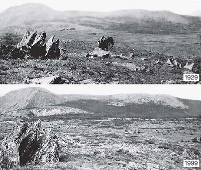 Fig. 3 - La limite forestière au Bolschoi Iremel, dans le sud de l’Oural: la comparaison des deux photos met en évidence la progression de la forêt. Photos: L. Tyulina 1929; P. Moiseev 1999