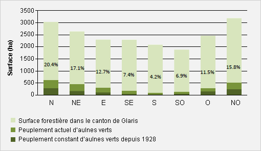 Fig. 5 - Exposition des aulnaies vertes par rapport à la surface forestière totale dans le canton de Glaris. Les pourcentages indiquent la proportion actuelle d’aulnes verts par rapport à la surface forestière du canton. Les colonnes sont superposées, et non pas empilées.