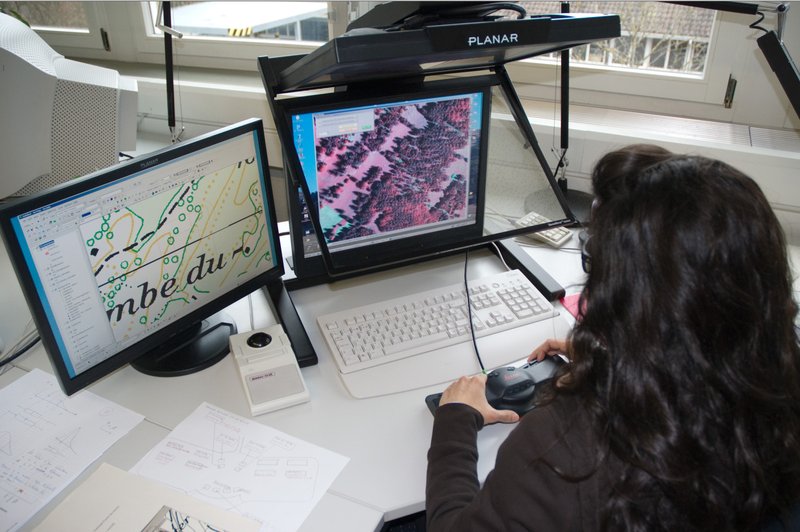 Fig 3 - Une collaboratrice du WSL interprète des photographies aériennes: ses lunettes spéciales lui permettent de voir l'image en trois dimensions. Pour chaque placette échantillon, elle détermine si celle-ci se trouve en ou hors forêt. Après vérification sur le terrain, sa décision constitue la base de l'estimation de la superficie forestière suisse. Photo Simon Speich (WSL)