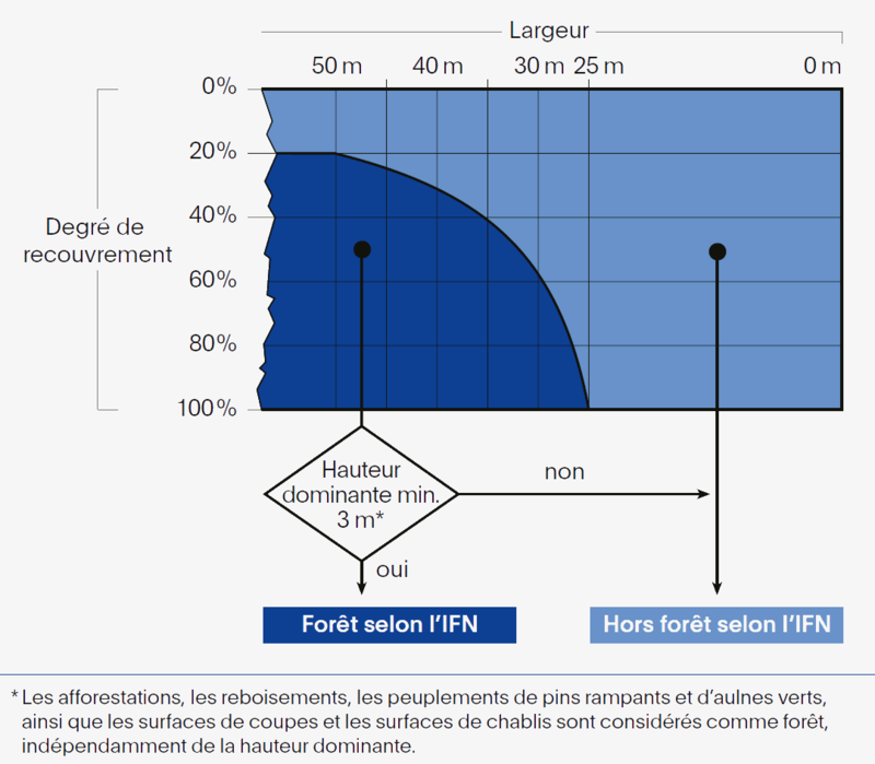 La définition de la forêt dans l’IFN repose sur trois critères: le degré de recouvrement, la largeur de la forêt et la hauteur des arbres. Une surface boisée est considérée comme forêt dès que sa largeur dépasse 50 mètres et que les couronnes des arbres couvrent plus de 20% de la surface au sol (voir illustration). Lorsque le boisement est plus dense, la largeur minimale requise diminue. Le boisement doit aussi atteindre une hauteur dominante minimale de trois mètres, sauf dans le cas des plantations, des rajeunissements, des surfaces forestières incendiées ou dévastées par les tempêtes, et des forêts buissonnantes.