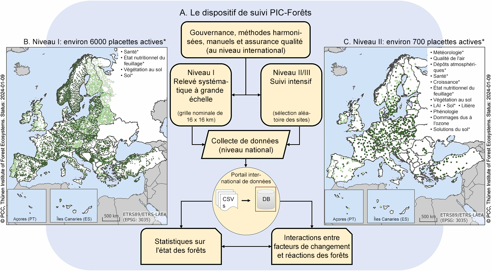 Fig. 3. Le système de surveillance paneuropéen PIC-Forêts. Le concept (A) est basé sur deux niveaux de suivi et deux réseaux (B: niveau I; C. niveau II; vert foncé: placettes actives en 2022; vert clair: placettes actuellement inactives). Le système fonctionne selon des méthodes harmonisées au niveau international pour les niveaux I et II. Toutes les méthodes sont disponibles sur http://icp-forests.net/page/icp-forests-manual. Les données de terrain sont validées au niveau national puis au niveau central, utilisées pour le reporting et mises à disposition sur demande.